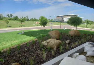 Entrance landscaping incorporating boulders and indigenous grass varieties