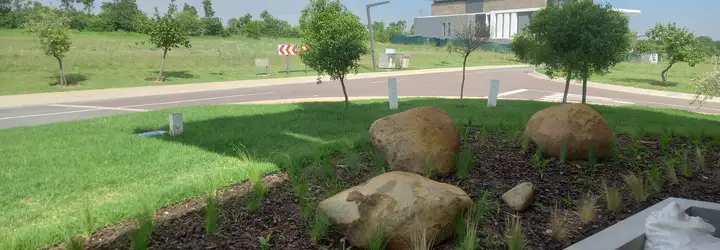 Entrance landscaping incorporating boulders and indigenous grass varieties