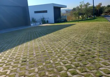 Custom designed concrete pavers and gravel paths, instant lawn,